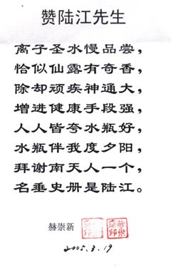 凡尊重中國(guó)古代養(yǎng)生智慧的患者,堅(jiān)持“已饑方食”和定時(shí)主動(dòng)補(bǔ)水者,均可祛病康復(fù)。如牡丹江醫(yī)學(xué)院87歲的張鵬圖飲用半年后高血壓未痊愈,陸江與他通話交流,了解他原先每日主食4兩,建議他用“已饑方食”減少主食肉食量,他理解后,將每日主食減為3兩,少吃兩塊肉,飲用一年治愈26年的冠心病和高血壓。他2003年5月31日來信說:“飲用卓康小分子團(tuán)水是根治高血壓、冠心病、糖尿病的一把金鑰匙,是填補(bǔ)醫(yī)學(xué)空白,為人類造福,應(yīng)推廣該產(chǎn)品?!?/strong>